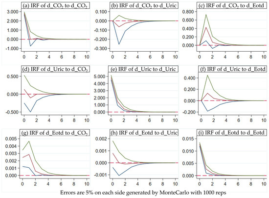 In this study, we utilize 1000 Monte Carlo simulations to analyze the impulse response functions of the three variables at the national and regional (eastern, central, western, and northeastern) scales over a 0–10 period under standardized shocks from each other. The results are illustrated in Figure 2, Figure 3, Figure 4, Figure 5 and Figure 6.
