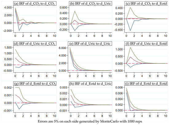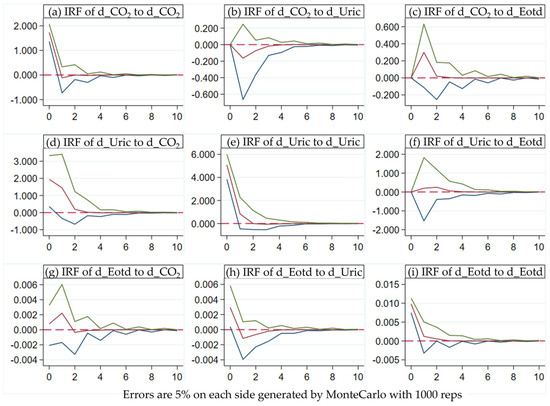 The following discussion unfolds on a regional scale. According to Figure 3a,e,i, Figure 4e,i, Figure 5a,e,i and Figure 6e,i, the impulse responses of regional Uric and Eotd to themselves are consistent with those at the national scale, as well as the impulse responses of CO2 in the eastern and western regions. Notably, the results in the central and northeastern regions are relatively complex (see Figure 4a and Figure 6a). As shown in Figure 3b, Figure 4b, Figure 5b and Figure 6b, the impulse response path of CO2 in the eastern, central, and northeastern regions is consistent with that of the entire country after the impact of Uric. Despite such high consistency, the western area shows an opposite trend, suggesting that the rebound effect of local Uric may increase CO2. As shown in Figure 3d, Figure 4d, Figure 5d and Figure 6d, the impulse response paths of Uric in the four regions impacted by CO2 are significantly heterogeneous. As illustrated in Figure 3c,g, Figure 4c,g, Figure 5c,g and Figure 6c,g, the impact response path between CO2 and Eotd in the four regions is consistent with that of the whole nation. In light of Figure 3f, Figure 4f, Figure 5f and Figure 6f the impact response path of Uric in the western and northeastern areas exhibits good agreement with that of the whole country following the Eotd impact. By comparison, the eastern and central regions experience a transition from a positive to a negative response, displaying a trend approaching 0, which indicates a more complex impact of Eotd on Uric in these regions. According to Figure 3h, Figure 4h, Figure 5h and Figure 6h, the response path of Eotd to the impact of Uric in northeastern region is consistent with that of the entire nation. The central and western regions exhibit a positive response that diminishes gradually; by comparison, a negative response with a similar decreasing trend is found in the east. These findings suggest that Uric in the central and western regions positively influences Eotd, while it delivers an inhibitory effect in the eastern part.