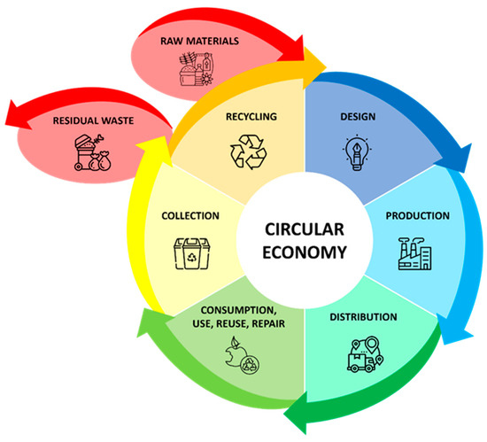 The renewal pathway continued in 2015 with the publication of the first CEAP, “Closing the Loop—An EU Action Plan for the Circular Economy” [30], whose main strategy was to produce no waste because today’s residual products are tomorrow’s raw materials. This could create a closed loop (Figure 2). New raw materials should be developed aiming at biodegradability, recyclability, and/or compostability, allowing them to be reintroduced into the natural environment. This would help stimulate job creation, economic growth, and investment, while supporting the transition to a carbon-neutral, resource-efficient, and competitive economy. The Action Plan also outlines a policy framework incorporating existing policies and legal tools to achieve targeted goals.