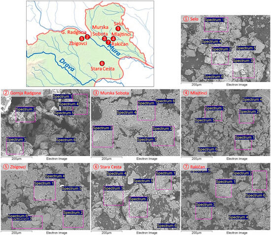 SEM and EDS analysis examples of each soil sample, with the sample locations marked on a map (the Pannonian region of Slovenia).