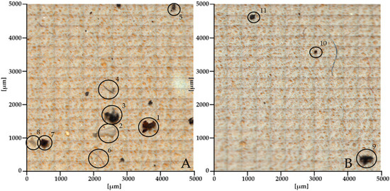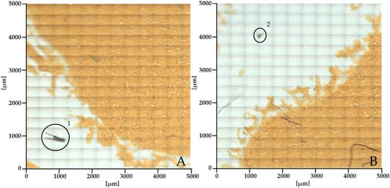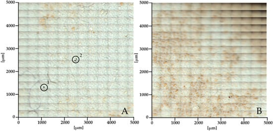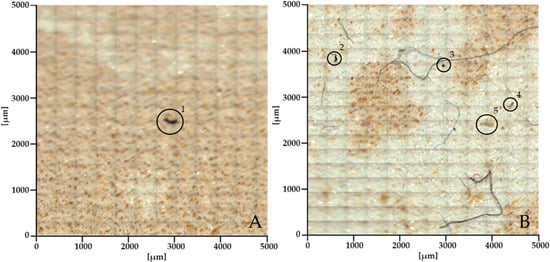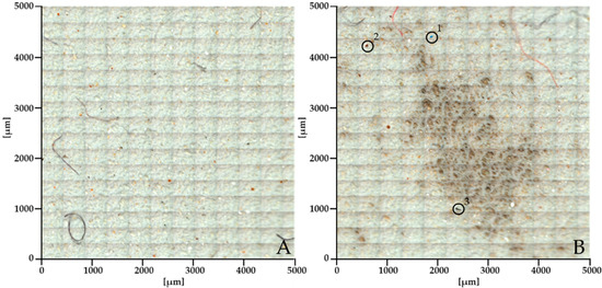 Stitched FTIR microscopy images of residues taken from the Rakičan filtered soil sample: (A) centre of filter and (B) bottom of filter.