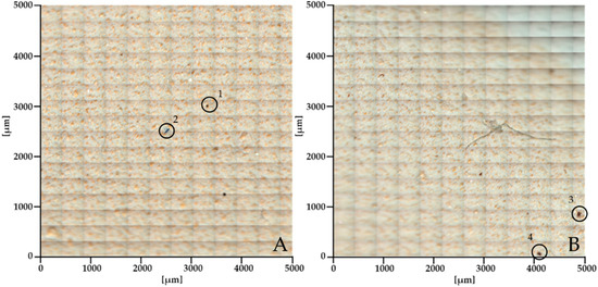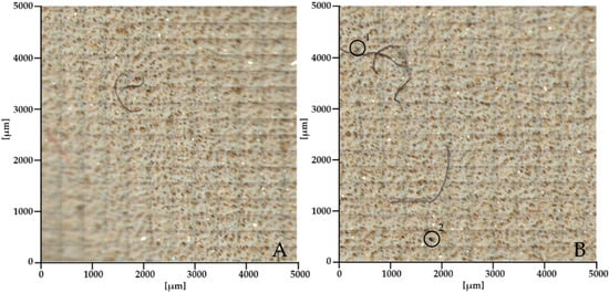 Stitched FTIR microscopy images of the residues taken from the Murska Sobota filtered soil sample: (A) centre of filter and (B) bottom of filter.