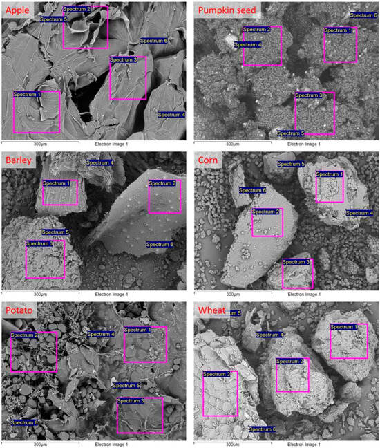 SEM equipped with an EDS detector was used for the investigations of the soil and crop samples. The used instrument was a Sirion 400 NC (FEI Sirion 400 NC, FEI Technologies Inc., Hillsboro, OR, USA), with an EDS INCA 350 (Oxford Instruments, Abingdon, UK). The soil samples were spread on graphite tape, adhered to an SEM sample holder and left to dry. The crop samples of pumpkin seeds, barley, corn, and wheat were firstly milled into smaller particles before being applied to the SEM holder with graphite tape. Slices of the freeze-dried apple and potato were also applied on matching holders. The samples were coated with Au for 60 s before performing the SEM and EDS analyses. A total of 24 EDS spectra were generated from each sample, from which the mean, standard deviation, maximum, and minimum values were calculated. The lower detection limit of the EDS analysis was 0.1 wt.%, with a relative uncertainty of ±2% for major constituents with a mass fraction greater than 10 wt.% [30]. The error distribution increased rapidly for minor constituents with mass fractions < 10 wt.%, having a relative uncertainty up to ±25% for standard calibrated procedures [31]. EDS analysis errors were considered to be suitable for the given investigation of the soil and crop samples.
