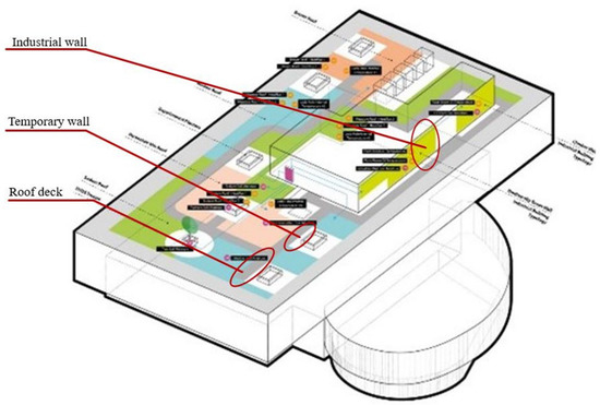 (A) Industrial wall, (B) roof deck, and (C) temporary wall.