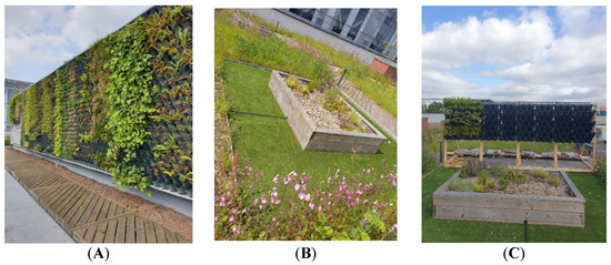 The green infrastructure structures in this study were an industrial wall, a temporary constructed green wall, and a roof deck area (see Figure 2A–C). The plants selected for the pre-testing phase and the main experiment were selected from the industrial wall on the roof of the Lady Hale Building and used for the temporary green wall and the roof deck area. For this study, the authors worked together with external companies for arrangements regarding the thermal camera (FLIR), the drone (Aerialworx, Manchester, UK and the creation and maintenance of a temporary green wall (GreeningUp, Chorley, UK). The temporary green wall was equipped with a manual controllable irrigation system which allowed us to irrigate the reference plants.