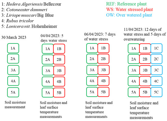 From each plant species, 5 pots were used for the pre-test experiment: 3 pots were used to measure three levels of water stress, 1 pot to measure over watering, and 1 pot for control. Measurements on soil moisture (30 March 2023; 4 April 2023; 6 April 2023; 11 April 2023) and leaf surface temperatures (4 April 2023; 6 April 2023; 11 April 2023) all took place between 13:00 and 14:00 PM on the selected days. The specific time frame was selected to detect the maximum temperature difference between stressed and non-stressed plants under sunny conditions or when the solar radiation is high [17]. On 6 April 2023, five control plants were transferred to the automotive lab and placed inside a large container filled with water and kept for 5 days to prepare the over-watered plants for comparison. A schematic representation of the pre-test experiment is shown in Figure 3.
