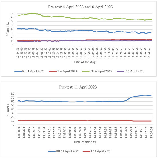 Air temperature (°C) and relative humidity (%) during the pre-test days.