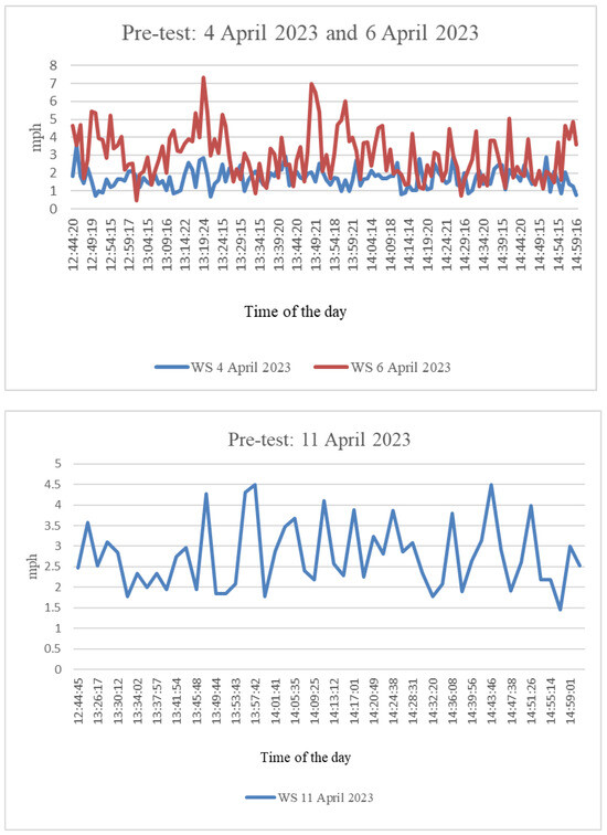 Soil moisture was measured manually with the Suplong soil moisture meter. The scale measurements range between 1 (dry) to 10 (wet). The FLIR E60bx handheld thermal camera (FLIR Systems UK, West Malling, United Kingdom) was used to read leaf surface temperature of each plant in Celsius (°C). The average of three readings for each plant were calculated and recorded. The emissivity was set to 0.98 as per recommendation by Hatfield [42], who stated that the emissivity for plants should typically be between 0.97 and 0.99. The weather data records from the University of Salford weather station were assessed for the days of the pre-test experiment to better understand and interpret the thermography of the plants. Studies argue that weather conditions, including wind, can influence the data [43,44]. The weather conditions assessed were air temperature (°C), relative humidity (%) (both presented in Figure 4), solar radiation (MJ/m2/day) (presented in Figure 5), and wind speed (mph) (presented in Figure 6) at the approximate time of the measurements. In Figure 3, Figure 4 and Figure 5, ‘T’ represents air temperature, ‘RH’ stands for relative humidity, ‘S’ denotes solar radiation, and ‘WS’ refers to wind speed.