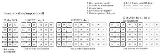 Schematic representation of preparing the plants for the three levels of water stress (level 1—11 days; level 2—8 days; level 3—3 days) for the industrial and the temporary wall until the experiment (2 June 2023).