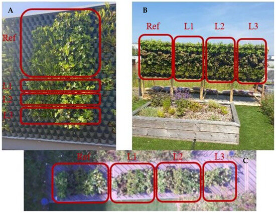Arranging the plant categories on the industrial wall (A), temporary wall p1 (B), and roof decking (C) for thermal imaging.