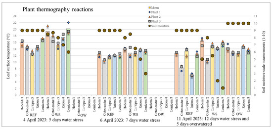 Thermography analysis and soil moisture measurements of five plant types analyzed in the pre-test phase. Measurements were performed on reference plants (REF), water-stressed plants (WS), and over-watered plants (OW) on the dates 4 April 2023, 6 April 2023, and 11 April 2023. Noted is that only on 11 April 2023 over-watered plants were measured.