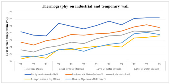 Thermography of three levels of water stress in five plant types on the temporary wall (1–3) and the industrial wall (4–5). Leaf surface temperatures were measured in °C.