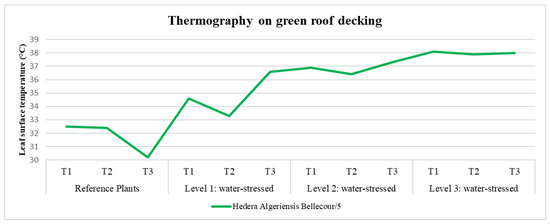 The findings in Figure 11 revealed leaf surface temperature differences between plant species, meaning that each plant species has a different tolerance to water stress. On the temporary wall, Pachysandra and Lonicera reported similar temperature increase in water-stressed plants compared to references plants (+2.34 °C) in comparison to Rubus (+2.7 °C). On the industrial wall, Liriope measured at +2.96 °C and Hedera at +3.2 °C in comparison to the reference plants. For the results of the green roof decking, presented in Figure 12, only Hedera was considered for comparison with water-stressed plants due to its location outside of the shadow from the other reference plants. The shade could potentially influence the results for the other plant species and were, therefore, not included in the analysis. A 6.3 °C average temperature increase was measured for Hedera between the reference plants and water-stressed plants.