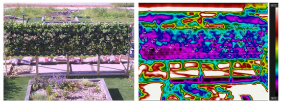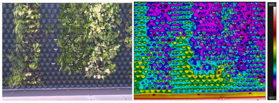 Figure 11 presents the thermography of three levels of water stress in plant types on the temporary wall and the industrial wall, while Figure 12 presents it on the roof decking. Table 5 reports the average temperature differences with reference plants for each GI structure. Figure 13, Figure 14 and Figure 15 present the thermal images and marked temperature reading spots on the industrial wall (Figure 13), the temporary wall (Figure 14), and green roof decking (Figure 15). The temperature differences between Hedera on the green wall (19.6–23.1 °C) and green roof (30.1–38.2 °C) can be explained as vertical structures receiving less direct sunlight compared to horizontal structures.