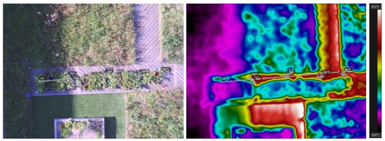 Thermal imaging with drones has proven to be a successful method for detecting drought stress in plants on green walls and green roofs, showcasing their potential even in high or difficult-to-access urban roof tops. The thermal images reveal temperature variations of around 3 °C between green walls and non-vegetated walls, and approximately 13 °C between green roofs and non-vegetated roofs [20,56]. This underscores the effectiveness of green roofs in reducing heat absorption. The presence of vegetation facilitates a cooling mechanism, primarily through evapotranspiration, which helps regulate temperatures. While the smaller temperature differences between green walls and non-vegetated walls were expected, as vertical surfaces receive less direct sunlight compared to horizontal roofs [39,57,58]. The modest temperature difference still demonstrates the positive impact of green walls in mitigating the urban heat island effect and improving quality of life. This emphasizes the value of green infrastructure in urban environments.