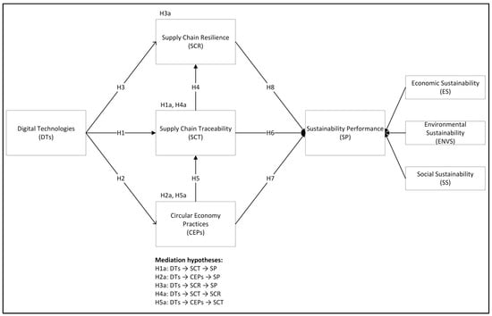 Examining the interplay between DTs and SP assumes a core role in shaping the corporate sector’s and society’s endeavors toward attaining sustainability objectives. This investigative pursuit aids industrial entities in fortifying their sustainability strategies and equips them with a more productive response mechanism to foreseeable environmental and social challenges. A selective understanding of how DTs advance various sustainable practices, such as optimization of resource use, energy consumption and distribution, improvements in productivity and operational efficiency, extended product lifecycles, and waste reduction, ref. [1] contributes significantly to businesses achieving these goals skillfully. In contrast to these contributions, the phenomenon of digital transformation can paradoxically pose a potential threat to sustainability. This danger arises from the reduction of product life cycles due to rapid technological developments, thus accelerating the obsolescence of previous technologies and devices and the excessive waste of raw materials and natural resources [2]. Addressing sustainability challenges in this context requires conscious management of products and materials from a sustainable perspective throughout their life cycles. Therefore, the integration of CE strategies in digital transformation processes is inevitable for sustainability purposes. Only in this way, CE opportunities, such as refurbishing equipment for the manufacturing industry, increasing employee productivity and motivation, establishing a smart factory based on resource efficiency, and designing closed-loop production process chains, can be provided [3]. Digital CE strategies support data transparency and accessibility by capturing detailed information on resource flows, material origins, manufacturing processes, and end-of-life operations [4]. On the other hand, the integration of advanced technologies in SC processes is bring increasingly discussed to understand the real-time and proactive exchange of granular information to achieve traceability and visibility in the SC [5]. Monitoring the entire product lifecycle or value-added process is also critical to the successful operation of the CE system [6]. Therefore, it is essential to develop a framework that evaluates the concepts of CEPs, SC traceability, and resilience in an integrated manner, and explains the interrelationships between these concepts on the path from adapting DTs to sustainability. Current researchers link DTs to various concepts, such as SCT [7,8,9], SCR [10,11,12,13,14], CEPs [2,4,15,16,17], and sustainable development [15,17,18]. Nevertheless, there is a lack of literature on developing an integrated model to capture how the adoption of DTs affects a firm’s SP through CEPs, SCT, and SCR, and to examine the relationships among these concepts. To address this gap, this study aims to adopt digital empowerment as a theoretical perspective to uncover how organizations utilize DTs to facilitate the SC and circularity process integration, thereby improving SP.