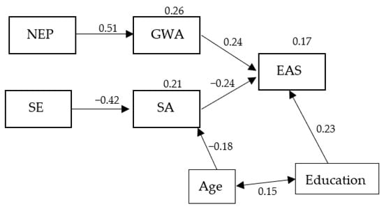 Since our goal was to compare the effects of two dispositional and two social–psychological factors in the prediction of EAS, a first path analysis was performed, introducing all factors (SA, SE, NEP and CCA) and the socio-demos (age and education) all together as direct predictors of EAS. However, unfortunately, the initial model showed poor fit indexes (χ2(15) = 124.186; p = 0.000; RMSEA = 0.19; SRMR = 0.15; CFI = 0.24; NNFI = −0.06). The inclusion of the correlations among the constructs did not improve the model fit substantially. This is because, although correlated with EAS, the NEP did not provide a significant independent contribution to the prediction of EAS, while SE confirmed its irrelevance in directly predicting EAS in this case. Moreover, age did not directly add to the prediction of EAS, either. However, the inspection of the modification indices (that we had explicitly requested as an output) suggested that the model could be substantially improved with the introduction of a direct path from NEP to CCA and from SE to SA. Furthermore, age emerged as a direct negative predictor of social anxiety. Since these modifications seemed theoretically plausible, we modified the model accordingly. The final model (Figure 1) showed good fit indexes (χ2(14) = 16.977; p = 0.257; RMSEA = 0.03; SRMR = 0.055; CFI = 0.98; NNFI = 0.97) and explained 17% of variance in EAS. Results of the Bollen–Stine bootstrap test [65]; see also [66]’s analyses performed on our data (bootstrap samples = 5000; p = 0.261), which supported the fit indexes statistical reliability. For these reasons, we concluded that our data fully supported H3, while H1 was supported only partially by the confirmation of the direct effect of social anxiety on EAS. The hypothesised direct effect of self-efficacy (H2) and the NEP on EAS were instead refuted.