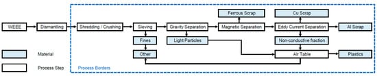 - Bruch, J.-R.; Bokelmann, K.; Grimes, S.M. Process development options for electronic waste fractionation to achieve maximum material value recovery. Waste Manag. Res. 2022, 40, 54–65. [Google Scholar] [CrossRef]