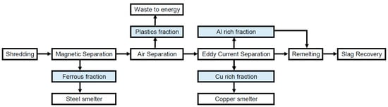During mechanical treatment, also called shredding and sorting, size reduction to particle sizes below 20 mm [27] by shredders or crushers is followed by sorting. Sorting technologies are sieving, hydrocyclones, air classification, flotation, jigging, electrostatic sorting, magnetic separation and eddy current separation [28]. The flow chart for the mechanical treatment is shown in Figure 2. Separation can be expected to result in 5 subfractions [23,28,29,30,31]: Al scrap, Cu scrap, ferrous scrap, plastics and other (including fines and glass). Naturally, materials can end up in the “wrong” subfractions due to imperfect sorting. This aspect is included in the calculations.