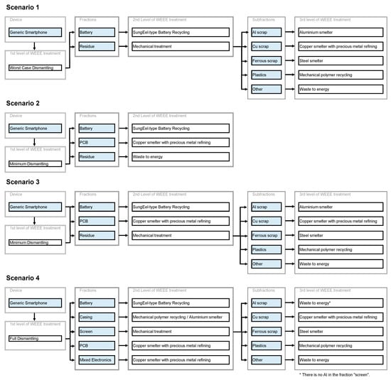 Scenario S1 represents the situation prior to the adaption of the WEEE directive including formal state-of-the-art treatment and the mere depollution of the battery due to safety issues, while scenarios S2 and S3 stand for the minimum requirements from the WEEE directive. In S2, the residue is not treated further, while the technically possible maximum is used in S3. The former is more likely for low-value electronics or highly heterogeneous waste streams, and can be considered the worst-case scenario when processing in the EU. Scenario S4 represents the best-case with full dismantling and the best available treatment technologies for each fraction.