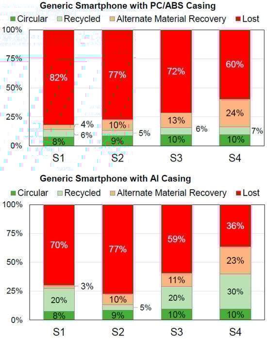 Regarding the results (Figure 5), multiple aspects are of interest. In the first and shortened assessments, the material flows in the categories “circular” and “recycled” are considered the total recyclability. In general, the smartphone with Al casing shows higher recyclability due to the higher efficiency of aluminum recycling compared to mechanical polymer recycling. Therefore, the use of aluminum as a casing material can be considered a design for recycling approach. However, formal and state-of-the-art WEEE treatment (scenarios S1, S3 and S4) is required. Otherwise, the “real” recyclability is not improved. The best effect is observed for scenario S4 due to the separation of the whole Al casing during dismantling. The total recyclability is increased from 16.3% for the smartphone with PC/ABS casing to 40.0% for the smartphone with Al casing. At this point, it is worth noticing that the recyclability assessment herein is based on the mass-balance of materials, only. It is not possible to draw any direct correlation between higher recyclability and lower environmental impact due to, e.g., differing energy demands for processing and transportation for different recycling scenarios. Consequently, the question of whether the use of an aluminum smartphone casing can be considered not only as a design for recycling, but also an ecodesign approach, would need further information based on assessments of the environmental impact of the respective recycling scenario, e.g., from a life cycle assessment (LCA). This beyond the scope of this case study.