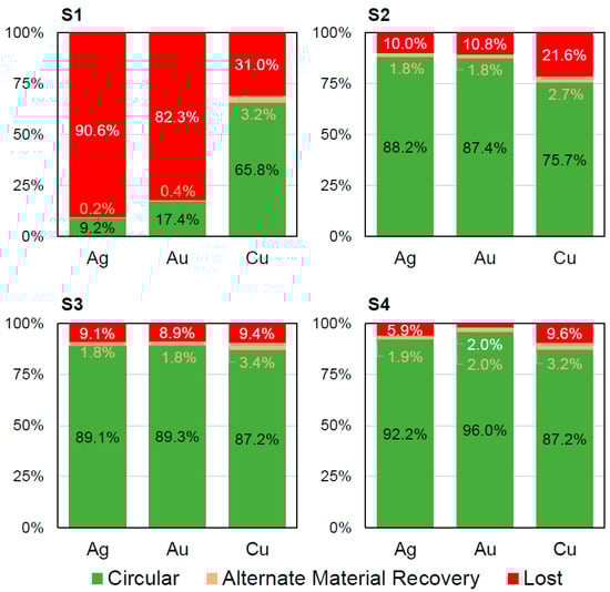 Overall, the material flow in the “circular” category is below 10% for all cases at the device level (Figure 5). It is only slightly increased from 8.6% for scenario S2 with minimal dismantling and no formal mechanical WEEE treatment to 9.7% for both scenarios S3 and S4 including formal mechanical treatment. The additional full dismantling in scenario S4 has no effect on the material flow in the “circular” category when compared to scenario S3. This highlights the huge room for improvements in the design for circularity and improved formal recycling infrastructure. Increasing the material flow in the “circular” category is essential on the way towards a circular economy for smartphones and, thus, should be in the interest of all stakeholders. At the material level (Figures S1–S8), strongly varying values are found for different materials. Figure 6 shows that metals like silver, gold and copper have materials flows of over 80% in the “circular” category in the case of formal state-of-the-art mechanical WEEE treatment (scenarios S2–S4). The lack of the separate treatment of the PCB in scenario S1 decreases the recyclability of silver and gold dramatically. In contrast, over 90% of the polymer’s material flows (namely PC, PC/ABS, PET and PMMA) are in the “lost” category in all four scenarios (Figures S1–S8). This highlights that the database and methodology presented herein can act as a powerful tool in design for recycling and for optimizing the technical recyclability of dedicated materials.