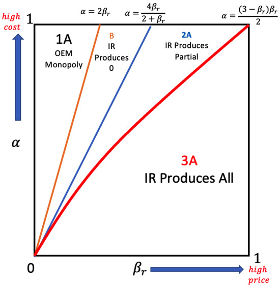 - When , denoted as Region A, the OEM is a monopolist, and the IR does not encroach on the market; the OEM’s and IR’s optimal quantities are , , and .