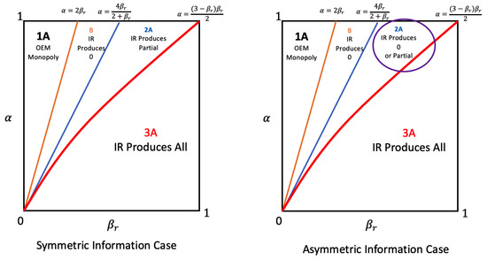 Figure A1 summarizes each case. When or , the IR’s decision is fixed and is not affected by the OEM’s decision.