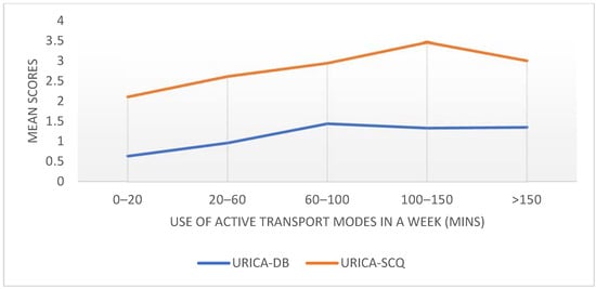 The post hoc Tukey’s HSD results indicated that the mean score of DB for the category of 0–20 min of weekly active transport modes use was significantly different from all categories except for 20–60 min of use (Table 4). Likewise, Tukey’s HSD results indicated that the mean score of SCQ for the category of 0–20 min of weekly active transport modes use was significantly different from all the rest of the categories (Table 4). The ANOVA and post hoc analysis indicated that the mean scores of DBI and SCQ increase as the use of active transport modes increase (Table 6).