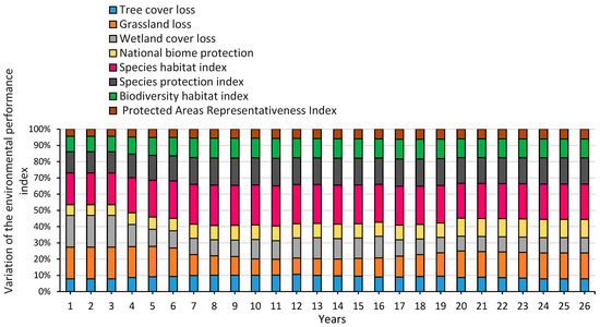The Yale Center for Environmental Law and Policy (YCELP) developed the environmental performance index (EPI) in 2020, which measures performance across 180 countries based on two objective policies for environmental health and ecosystem vitality and provides a data-driven summary of sustainability with 32 performance indicators across 11 issue categories [71]. The environmental performance index (EPI) is a generated weighted composite index that evaluates various fields by mathematically quantifying and designating the implementation of a state’s policies. Using a target proximity technique, each nation is given a performance score with a value between 0 and 100. The comparatively higher values, which are closer to 100, indicate correctness in performance policy concerns [34]. In this study, from the EPI objectives, the policy objective of ecosystem vitality was selected, particularly biodiversity and habitat, and ecosystem services, to assess its impact on landscape fragmentation using a Spearman correlation analysis. The indicators from 1995 to 2020) are presented in Figure 2 (1 to 26). These indicators include the species protection index (PSI), species habitat index (SHI), Terrestrial Biome Protection (TBN), and Protected Areas Representativeness Index (PAR), as well as indicators related to ecosystem services such as the tree cover loss (TCL), grassland loss (GRL), and wetland loss (WTL). The 2020 EPI presents the results of process indicators, which are scored from 0 to 100. It is specifically available in the Environmental Performance Index, 2020, released by Environmental Performance Index (EPI) | Socioeconomic Data and Application Center (SEDAC) [72].
