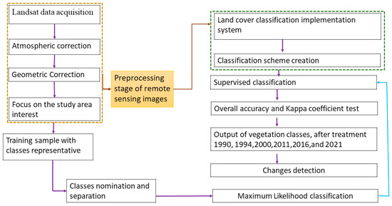 Remotely sensed data from Landsat 5 Thematic mappers (TMs) and Landsat 8 Operational Land Images (OLIs) were obtained from the United States Geological Survey (USGS) website (https://earthexplorer.usgs.gov/, accessed on 24 January 2023 at a 30 m spatial resolution). This study utilized Landsat 5 TM images from the years 1990, 1994, 2000, and 2011 and Landsat 8 OLIs from the years 2016 and 2021. The scene path and row values for all images were 173 and 62, respectively, and the cloud coverage was less than 10%. All images were level-1 products and were projected onto the Universal Transverse Mercator (UTM) grid using the WGS-84 datum. To ensure high-quality datasets, the overlay technique of geometry correction was applied to mask cloud patches, and atmospheric corrections were made to eliminate haze and aerosol contamination [62]. To minimize the impact of seasonal differences in vegetation phenology between study periods, image scenes were downloaded with similar satellite overpass times or seasons. Specifically, the dry periods ranging from January to February and from July to August were chosen to reduce cloud cover and ensure consistency between the images used in this study.