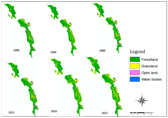 When comparing the changes shown in Figure 6a,b between 1990 and 1994, open land and water bodies decreased from 2.124% to 1.69% and from 0.352% to 0.217%, respectively, while forestland decreased from 86.1% to 84.62% and grassland expanded from 11.43% to 13.47%. From 1994 to 2000, forestland and open land were reduced to 84.41% and 0.949%, while grassland and water increased to 14.4% and 0.239%. From 2000 to 2011, forestland and water were reduced to 84.1% and 0.224%, while open land and grassland increased again to 1.531% and 14.24%, respectively. From 2011 to 2016, forestland and open land were reduced to 83.35% and 0.593%, while grassland and water bodies increased to 15.83% and 0.23%, respectively. From 2016 to 2021, forestland and water were reduced to 81.32% and 0.178%, while grassland and open land increased to 17.37% and 1.13%. Between 1990 and 2021, forestland, open land, and water bodies were reduced by 4.78%, 0.99%, and 0.171%, whereas grassland increased by 5.94%. Various human influences contributed to the declines in open land, water, and forestland. However, the increase in grassland might be attributable to both conservation efforts and rainfall’s ability to promote vegetation regeneration.