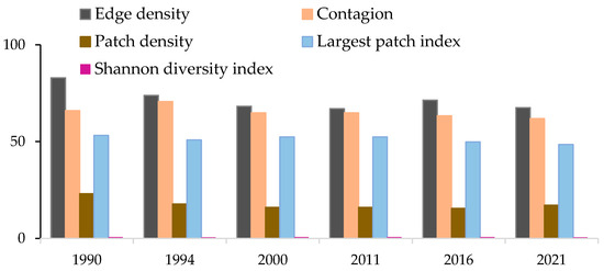 According to McGarical and Marks et al. [63], we used FRAGSTATS v. 3.3 to quantify five landscape metrics, including the patch density (PD), edge density (ED), largest patch index (LPI), Shannon diversity index, and contagion (CONTAG). These metrics provide indications of the physical fragmentation [64], the diversity richness [65], and the degree of clumping of the attributes [66], respectively (Table 1). The fragmentation index was measured at the landscape level based on the land use type and then compared to the trends between the 1990, 1994, 2000, 2011, 2016, and 2021 periods.