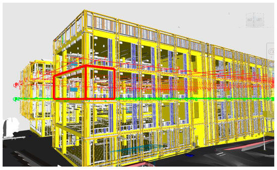 Extracts from the BIM model showing a modular unit of a Façade Structural System (inside the red box) located at upper levels, which can be associated with many risks such as constructability and safety procedures.