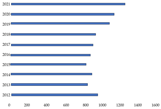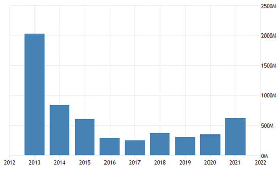 It was precisely in 1986 that the government dissolved the board and tried to look for a way forward in expanding the cocoa, palm tree, and cassava plantations and trade activities. As a result of a lack of viable and active means of selling the product, the farmers decided to sell it indirectly to either licensed agents or cooperatives who consequently sell to the exporting firms. The literature contends that small-scale farmers also engage in cocoa, palm tree, and cassava plantations or cultivations, and there are currently a number of states that partake in the production of cocoa, palm trees, and cassava such as the Cross River, Delta, Ekiti, Ondo, Ogun, Osun, and Oyo states [59]. Indeed, the roles of smallholder farmers cannot be underestimated pertaining to food security and overall socio-economic productivity in the southern part of the country in particular and the entire nation in general [60]. It is reiterated that, in the past ten years, Nigeria has led in the production of cocoa; however, in the last few years, there has been a decrease in cocoa production in the country. Figure 3 shows Nigeria’s export of cocoa and cocoa preparation.