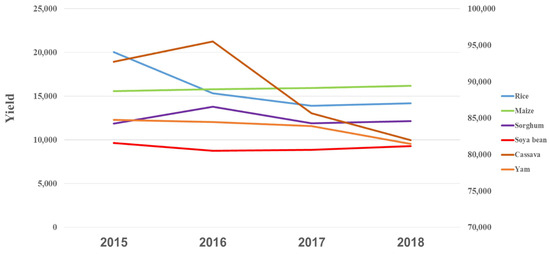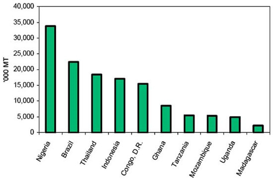 Third, the botanical name of cassava is Manihot esculenta which is a woody shrub of the spurge family [65]. Indeed, cassava is another important plantation explored in this study. Historically, cassava is a crop originally from South America that was introduced in the southern part of the country during the slave trade in the 16th century. It is noteworthy to mention, in agreement with previous studies, that there was a boost in the agricultural sector with a specific emphasis on cassava crop production in the 19th century [66]. Thus, cassava is indeed considered a prime economic sustenance crop for improving socio-economic development in the country. Reiteratively, Nigeria is one of the largest producers of cassava in the entire world, and the country’s production of the product constitutes 19% of the entire world’s production. A previous study has affirmed that out of 36 states in the country, 24 states such as Anambra, Delta, Edo, Benue, Cross River, Imo, Oyo, Rivers, etc., are major producers of cassava, as the literature contends [67]. In more than two decades, the country has produced more than 45 tons of cassava, and in the year 2000, the average yield per hectare was 10.6 tons. In the year 2010, the government targeted 150 million tons of cassava which led to USD 5 billion earnings from annual exports [68]. Hence, due to the exorbitant profit from cassava investment, there was an adopted innovation that led to the introduction of vitamin A-rich cassava in the country. Subsequently, the government introduced other pro-Vitamin A varieties of cassava by targeting and empowering approximately 1.8 million farmers. Reiteratively, cassava is one of the essential commodities for the country’s potential income from agricultural products with output tons of 59, 193, 708 and the potential income estimate of 11.72, as shown in Table 4.