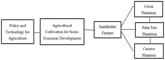 The government has been showing dedication toward enhancing the agricultural sector by promoting plantations of cocoa, palm trees, and cassava among smallholder farmers, as the literature explicates [11]. In the past, an overwhelming number of studies have explored the efforts of the government to diversify the agricultural sector, especially by improving various aspects such as maize, yam, and cocoa farmers, among others. For instance, the government provides organic insecticides in order to protect maize against army worm infestations [11]. The literature contends that various aspects of human endeavor can be improved through the products harvested from different plantations, and more importantly, small and medium enterprises (SMEs) can be supported in society [12]. Nevertheless, there is little focus or connection between cocoa, palm tree, and cassava plantations as a mechanism for mitigating the socio-economic effects of poverty and unemployment. In other words, adequate mechanisms for using cocoa, palm tree, and cassava plantations to mitigate the socio-economic effects of poverty and unemployment by giving support to smallholder farmers have not been adequately explored in the existing body of knowledge.