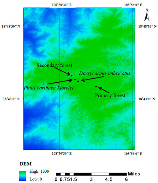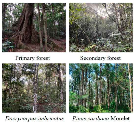 Through logging records and interviews with loggers, the formation history of the secondary forest, Dacrycarpus imbricatus, and Pinus caribaea Morelet due to commercial logging demand was established (Figure 1). In this study, the vegetation in the sampling points of the secondary forest was formed after the primary forest was cut down in 1958–1960, and the forest age was 63 years. The Dacrycarpus imbricatus sampling site was planted after the primary forest was cut down in 1975, and the forest age was 48 years. The Pinus caribaea Morelet sampling site was planted in 1995 after the secondary forest was felled, and the forest age was 28 years.