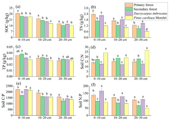 The SOC, TN, and TP contents showed a decreasing trend with the increase in soil depth (Figure 3a–c). At 0–10 cm and 10–20 cm soil depths, the SOC content of the primary forest was significantly higher than that of the secondary forest (12.9% and 10.4%, respectively), which was also significantly different from Dacrycarpus imbricatus and Pinus caribaea Morelet (Figure 3a). The TN content of the primary forest and the Dacrycarpus imbricatus forest at 0–10 cm, 10–20 cm, and 20–30 cm soil depths was significantly higher than that of the secondary forest and Pinus caribaea Morelet forest (Figure 3b). In the 0–10 cm soil layer, the TP content of the secondary forest was the highest (0.38 g/kg), and that of the Pinus caribaea Morelet forest was the lowest (0.29 g/kg) (Figure 3c).