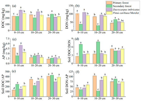 The DOC content of the Dacrycarpus imbricatus forest in the 0–10 cm soil layer was significantly higher than that in the primary forest by 40.4%. The DOC content of the Dacrycarpus imbricatus forest in the 10–20 cm soil layer (302.99 mg/kg) was significantly higher than that of the primary forest (19.1%). In the 20–30 cm soil layer, the DOC content of the secondary forest was the highest (265.66 mg/kg), which was significantly higher than that of the primary forest by 26.7% (Figure 4a). The DON content in the 0–10 cm and 10–20 cm soil layers had a similar pattern, and the highest was in the Dacrycarpus imbricatus forest (109.99 mg/kg and 94.59 mg/kg, respectively), and the lowest was in the secondary forest (38.56 mg/kg and 30.54 mg/kg, respectively). In the 20–30 cm soil layer, the DON content of the secondary forest was the highest (67.53 mg/kg), which was significantly higher than that of the primary forest (47.6%) (Figure 4b). The AP content of the primary forest in the 0–10 cm soil layer was significantly higher than that in the secondary forest (99.5%) and Pinus caribaea Morelet forest (41.2%). In the 10–20 cm soil layer, the AP content of the primary forest was significantly lower than that of the secondary forest and the Dacrycarpus imbricatus forest by 23.5% and 27.7%, respectively (Figure 4c).