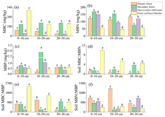 The soil MBC:MBN atomic ratio ranged from 0.27 to 10.03, and the MBC:MBN atomic ratios of the Pinus caribaea Morelet forest in the 0–10 cm, 10–20 cm, and 20–30 cm soil layers (10.03, 5.49 and 4.66, respectively) were significantly higher than those of the primary forest. The MBC:MBN atomic ratio in the 20–30 cm soil layer of the secondary forest was significantly higher than that of the primary forest by 878.9% (Figure 5d). The soil MBC:MBP atomic ratio ranged from 51.23 to 2421.56, and the MBC:MBP atomic ratios of the Pinus caribaea Morelet forest were the highest in the 0–10 cm and 10–20 cm soil layers (2421.57 and 1553.73, respectively). In the 20–30 cm soil layer, the MBC:MBP atomic ratio of the secondary forest soil was the highest (981.18), and there were significant differences among different plots (Figure 5e). The soil MBN:MBP atomic ratio ranged from 119.63 to 1226.25, and the MBN:MBP atomic ratios in the 0–10 cm and 10–20 cm soil layers of the primary forest were the highest (737.47 and 1226.26, respectively). In the 20–30 cm soil layer, the MBN:MBP atomic ratio of the Dacrycarpus imbricatus forest was the highest (727.92) (Figure 5f).