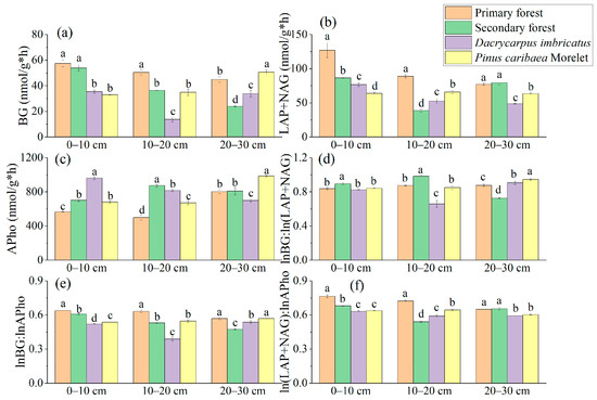 The BG activity in the 0–10 cm soil layer of the primary forest was significantly higher than that of the Dacrycarpus imbricatus forest (62%) and Pinus caribaea Morelet forest (73.8%). In the 10–20 cm soil layer, the BG activity of the primary forest was the highest (57.45 nmol/g*h), and the BG activity of the Dacrycarpus imbricatus forest was the lowest (35.46 nmol/g*h) (Figure 6a). In the 0–10 cm soil layer, the (LAP + NAG) activity of the primary forest was the highest (127.02 nmol/g*h), which was significantly higher than that of the secondary forest (46.8%), Dacrycarpus imbricatus forest (65.8%) and Pinus caribaea Morelet forest (98.6%). In the 10–20 cm soil layer, the (LAP + NAG) activity of the primary forest was the highest (88.82 nmol/g*h), which was significantly higher than that of the secondary forest (129.8%), Dacrycarpus imbricatus forest (69.4%) and Pinus caribaea Morelet forest (35.4%). In the 20–30 cm soil layer, the (LAP + NAG) activity of the Dacrycarpus imbricatus forest was 58.5% lower than that of the primary forest. In addition, the activity of (LAP + NAG) in the Pinus caribaea Morelet forest soil was significantly lower than that of the primary forest soil by 21.7% (Figure 6b). In the 0–10 cm soil layer, the APho activity of the Dacrycarpus imbricatus forest was significantly higher than that of the primary forest by 69.5%. In the 10–20 cm soil layer, the APho activity of the secondary forest was the highest (873.39 nmol/g*h), which was significantly higher than that of the primary forest by 75%. In the 20–30 cm soil layer, the APho activity of the Pinus caribaea Morelet forest was the highest (986.66 nmol/g*h) and was significantly higher than that of the primary forest by 23%, while the APho activity value of the Dacrycarpus imbricatus forest was the lowest (698.57 nmol/g*h) and was significantly lower than that of the primary forest by 14.7% (Figure 6c).