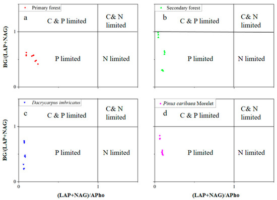 The lnBG:ln(LAP + NAG) value ranged from 0.66–0.98. In the 0–10 cm soil layer, the lnBG:ln(LAP + NAG) value of the secondary forest was the highest (0.89). In the 10–20 cm soil layer, the lnBG:ln(LAP + NAG) value of the secondary forest was the highest (0.98). The lnBG:ln(LAP + NAG) value of the Dacrycarpus imbricatus forest was the lowest (0.66), which was significantly lower than that of the primary forest by 32.4%. In the 20–30 cm soil layer, the lnBG:ln(LAP + NAG) value of the Pinus caribaea Morelet forest was the highest (0.95) (Figure 6d). The lnBG:lnAPho value ranged from 0.39–0.63. In the 0–10 cm and 10–20 cm soil layers, the lnBG:lnAPho values of the primary forest were the highest (0.64 and 0.63, respectively). In the 20–30 cm soil layer, the lnBG:lnAPho value of the secondary forest was the lowest (0.47) and was significantly lower than that of the primary forest by 19.1% (Figure 6e). The ln(LAP + NAG):lnAPho value ranged from 0.54–0.76. In the 0–10 cm soil layer, the ln(LAP + NAG):lnAPho value of the primary forest was the highest (0.76), which was significantly higher than that of the secondary forest by 12.2%, the Dacrycarpus imbricatus forest by 20.9% and the Pinus caribaea Morelet forest by 19.7%. In the 10–20 cm soil layer, the ln(LAP + NAG):lnAPho value of the primary forest was the highest (0.72) and was significantly higher than that of the secondary forest (33.9%), Dacrycarpus imbricatus forest (22.3%) and Pinus caribaea Morelet forest (12.2%) (Figure 6f). In addition, in the scatter plot, we found that the values of soil BG/(LAP + NAG) and (LAP + NAG)/APho in the study area were both less than 1 (Figure 7).