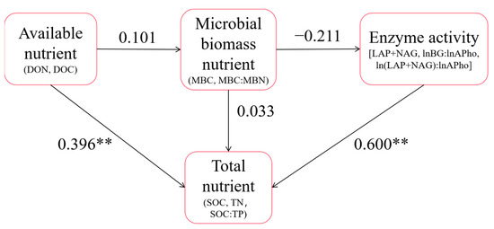 SEM diagram. The nutrient indices and stoichiometric characteristics measured in this study were divided into four categories: total nutrient, available nutrient, microbial biomass nutrient and enzyme activity. On this basis, the SEM was constructed, and the index with a standardized load coefficient less than 0.6 was eliminated. Finally, the results of the structural equation model were obtained and ** represents p < 0.01.