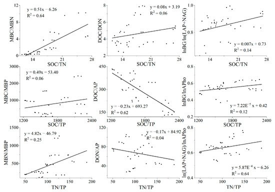 From the results of linear regression, we can conclude that when the soil C:N:P value increases, the microbial biomass C:N:P value and the enzyme activity ratio also increase (Figure 9). At the same time, we found a downward trend in DOC/AP and DON/AP. In addition, from Table 2, we found that forest type has a wide and significant influence on soil stoichiometric characteristics.