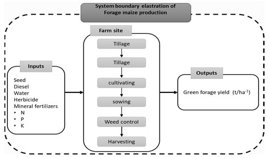 The goal of this study was to quantify (a) the environmental impacts of different mineral fertilizer and pesticide dose applications and (b) the impact of different mineral fertilizer and pesticide doses on yield within the framework of determining emission limits in silage maize production. The achieved results are useful for promoting the overall reduction of environmental impact by optimizing mineral fertilizer and pesticide doses. The system boundaries define the life cycle processes that belong to the analyzed system []. For this study system boundaries were all processes from “cradle to farm gate” which includes all inputs, upstream processes, and outputs as shown in Figure 1. The functional unit chosen for this study was 1 ton of final product and the mass allocation principle was employed. The functional unit determines the nature of the study outputs and their interpretation is one of the key moments in implementing the LCA study [,,] and is a quantitative description of the function of the system. The transport distance between the field and the farm site was estimated to be 5 km. This study was conducted according to the guidelines of the International Organization for Standardization [,].