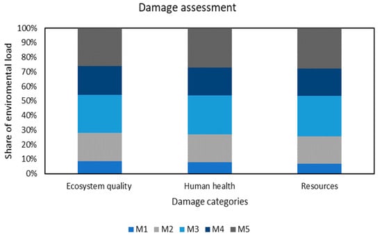 The results of the six midpoint impact categories a related to damage categories (1) ecosystem quality, (2) human health, and (3) resources. According to results in Figure 2 for damage impact categories human health and resources the M5 variant recorded the highest environmental load. For damage category ecosystem quality, the highest environmental load was associated with variant M3. Overall, the control variant M1 recorded the least environmental load.