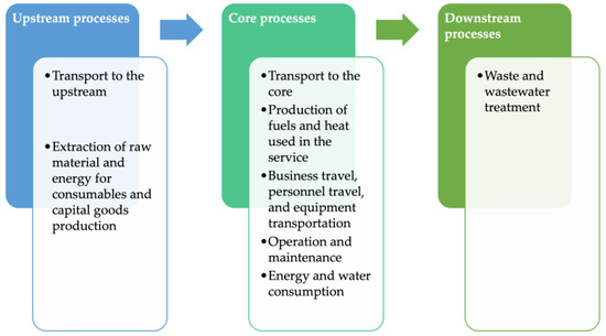 The system boundaries applied follow a “cradle-to-grave” approach. The processes considered in the analysis, categorized into three phases—namely, “upstream”, “core”, and “downstream”—comprise the aspects outlined below.