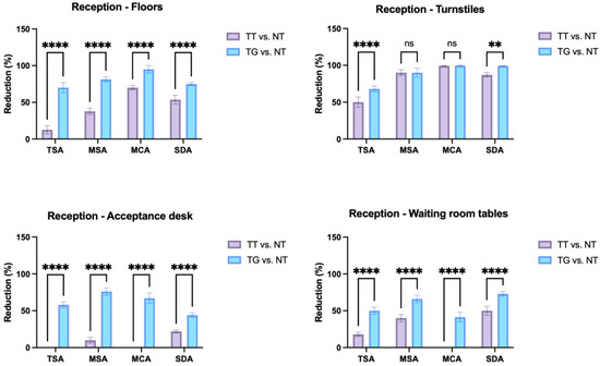 Reduction in colony formation units expressed as a percentage between non-treated (NT) and treated conditions (TT and TG) for various aspects of the reception area, including the floor area, acceptance desk, turnstiles, and waiting room tables. The data represent the average of two separate experiments conducted in triplicate (mean ± standard deviation), ** p-values < 0.01, **** p-values < 0.001, ns: not significant.