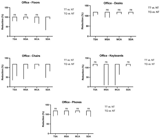 Reduction in colony formation units expressed as a percentage between non-treated (NT) and treated conditions (TT and TG) for various aspects of office-related elements, such as the floor area, desktop, chairs, keyboard, and phones. The data are the average values from two separate experiments conducted in triplicate (mean ± standard deviation), and the results are expressed as percentages: ns: not significant.